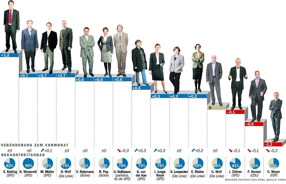 Wowereit konnte auch auf der Skala der beliebtesten Politiker einen Rang aufholen, was aber ausschließlich auf den Absturz von Ulrich Nußbaum zurückzuführen ist. Der Finanzsenator wurde von den Berlinern um 0,3 Punkte schlechter bewertet als im Juli und fiel vom zweiten auf den siebten Platz. Forsa-Chef Güllner hatte dafür am Montag eine Erklärung: „Der Bonus, den parteilose Politiker häufig in der Bevölkerung haben, scheint sich langsam aufzubrauchen“, sagte er.