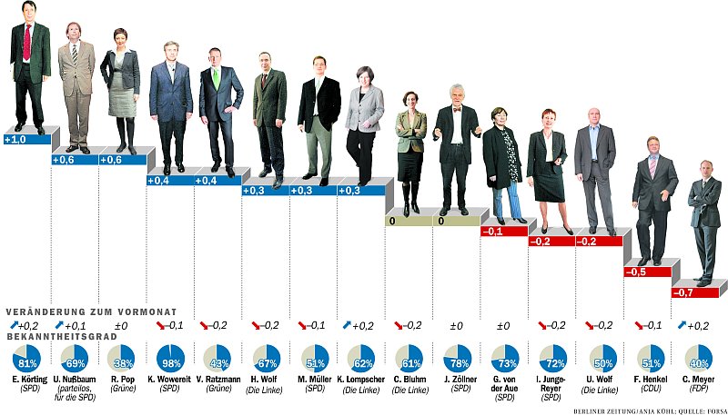 Die SPD schreitet nach den Wahlschlappen im Jahr 2009 bei ihrem Wiederaufbauwerk voran. Selbstkritik, Bürgerforen und Wowereit-Touren scheinen zu nutzen. Mit 26 Prozent (plus 1) würde sie stärkste politische Kraft, wenn am Sonntag Abgeordnetenhauswahlen wären. Die von Forsa befragten Berliner differenzieren jedoch. Wäre Bundestagswahl, würden die Grünen mit 24 Prozent stärkste Kraft. Die SPD läge hinter der CDU (23 Prozent) mit 22 Prozent nur auf Platz 3.