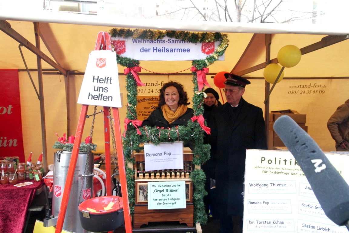 Die Weihnachtsfeier der Heilsarmee Berlin-Prenzlauer Berg wird seit mehreren Jahren in einem großen Berliner Hotel gefeiert. Um für die Feier die nötigen Spenden zusammen zu bekommen, gab es auch in diesem Jahr während der Marktzeit auf dem Kollwitzplatz eine Drehorgelaktion mit Politikern. Für Ramona Pop eine Herzenssache, beim Füllen der Sammelbüchse tatkräftig zu helfen und Drehorgel zu spielen.