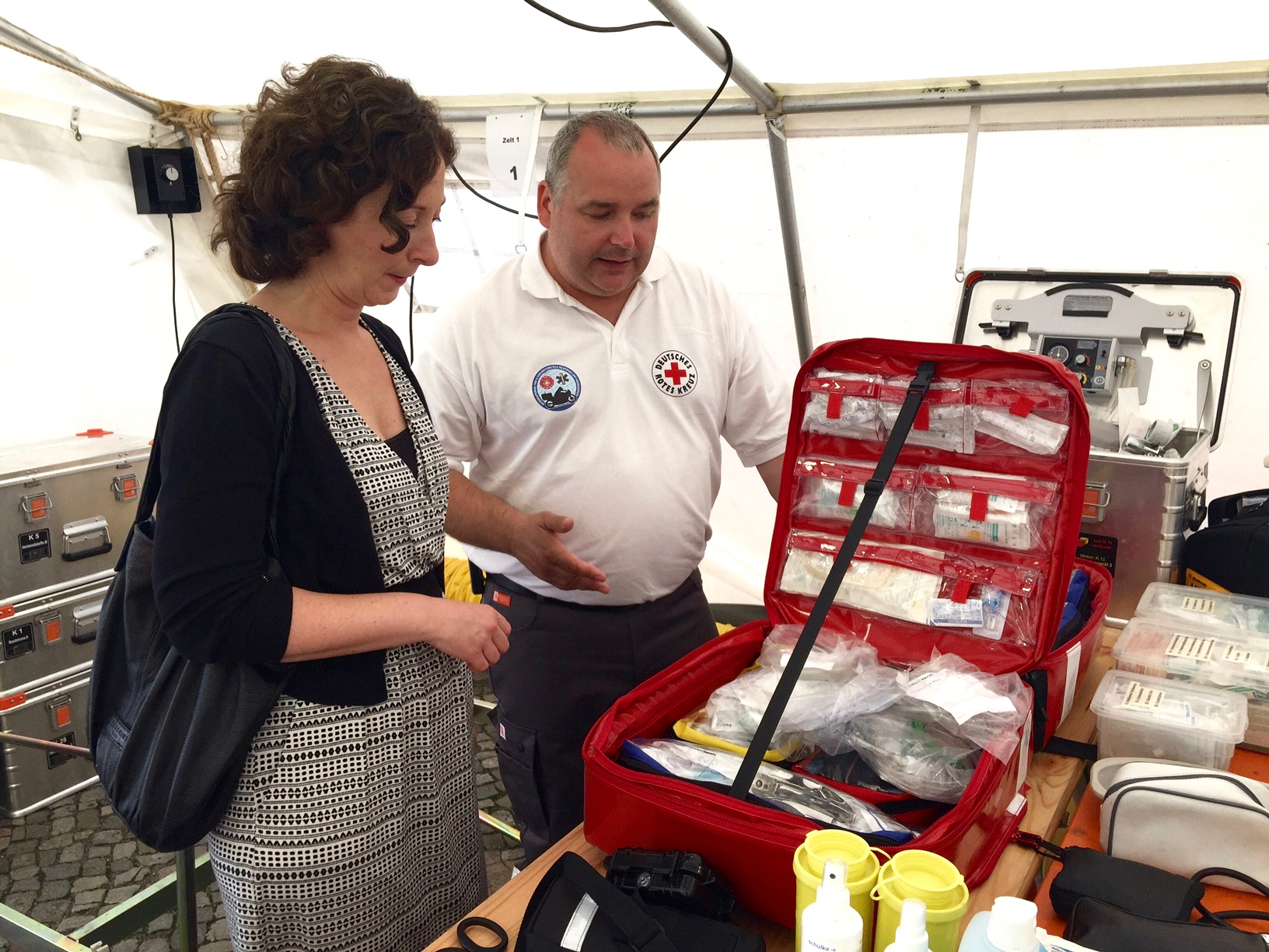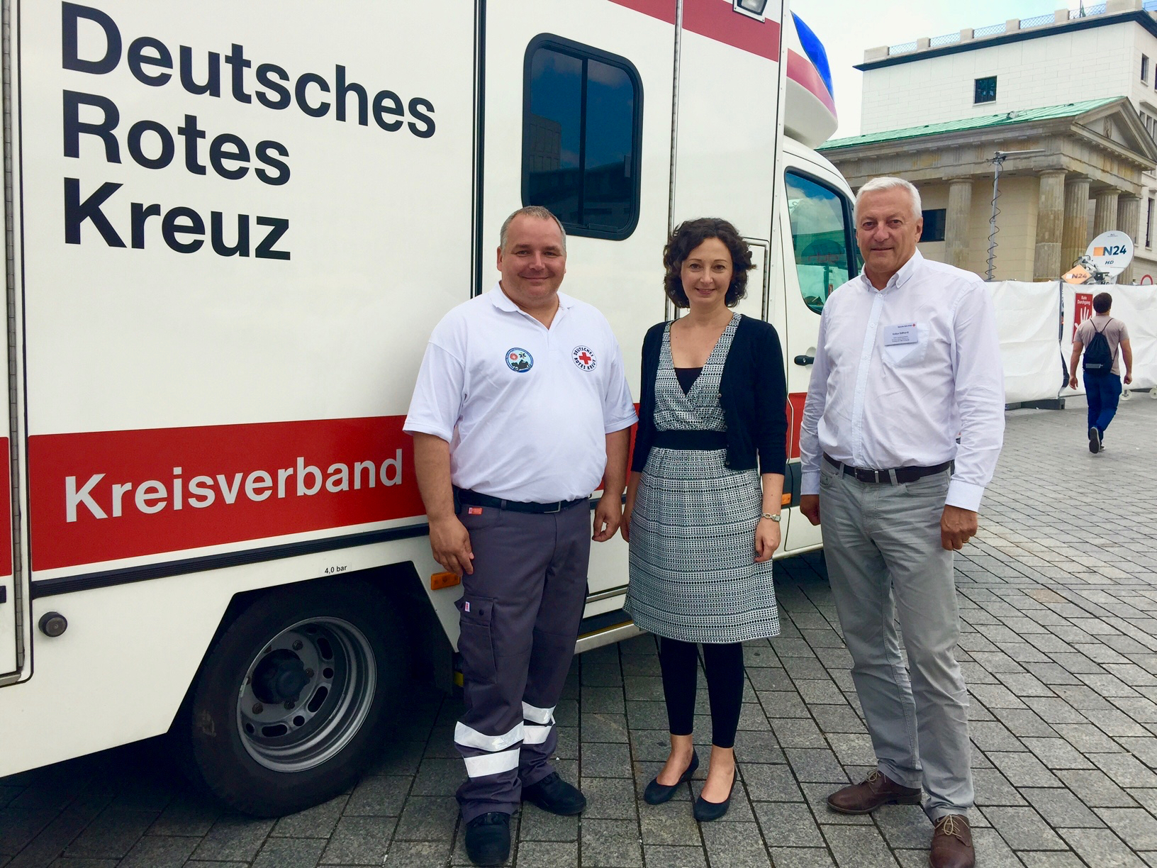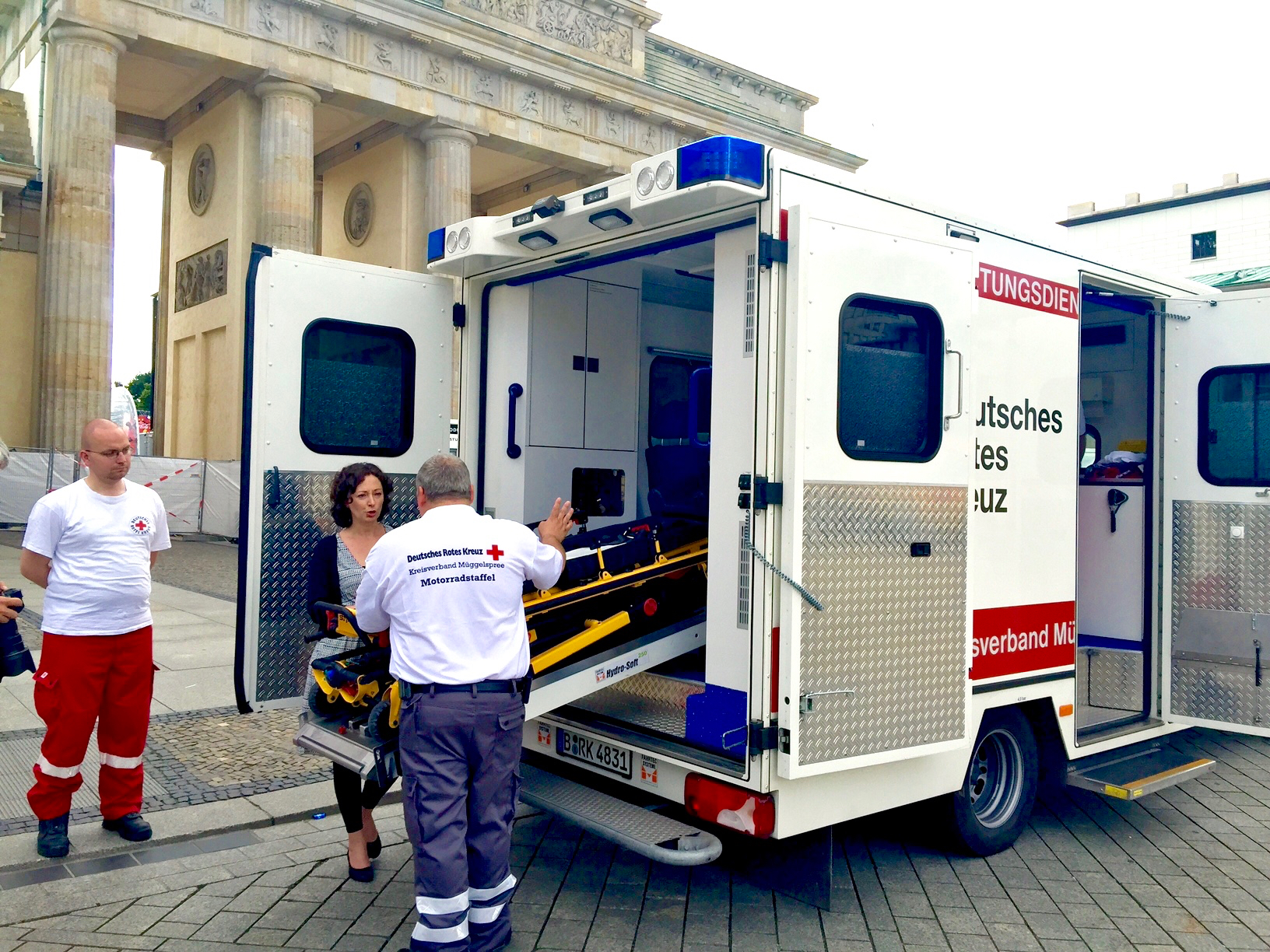 Ramona Pop informierte sich im Vorfeld des EM-Spiels Nordirland-Deutschland am 21. Juni 2016 über die Sanitäts- und Rettungsarbeiten des Deutschen Roten Kreuzes bei der Durchführung einer Großveranstaltung. Dabei besichtigte sie die Unfallhilfsstelle des DRK auf der Berliner Fanmeile und gewann einen Einblick in die Arbeit der freiwilligen Helfer vor Ort.