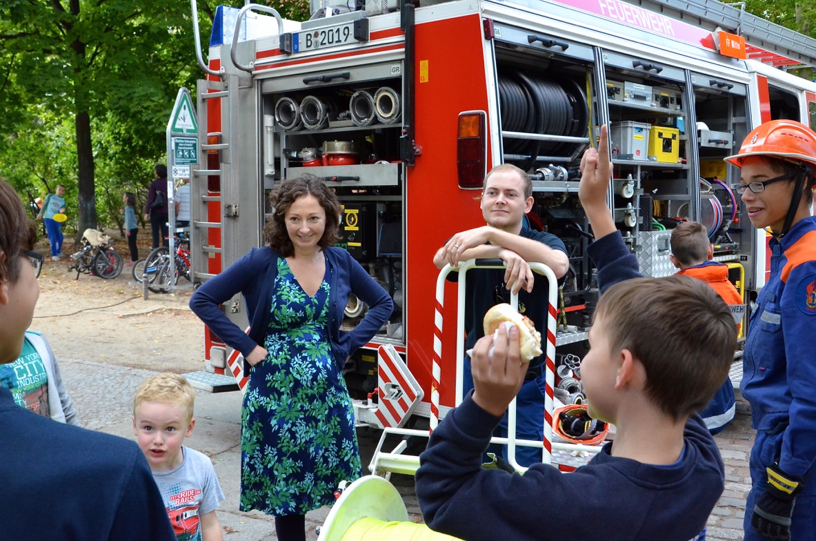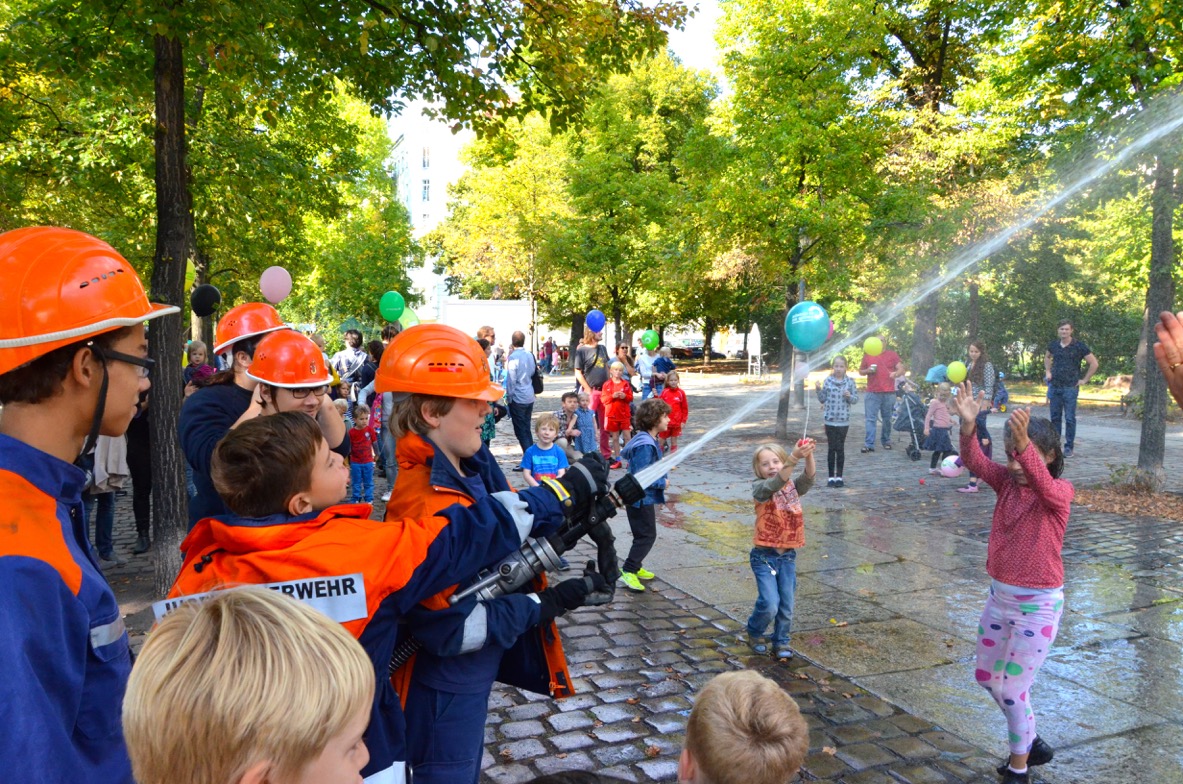 Zahlreiche Kinder und Jugendliche und viele Erwachsene waren der Einladung gefolgt und bevölkerten gut gelaunt den Platz. Für alle Kinder gab es wie jedes Jahr viel zu erleben. Neben Hüpfburg, Kinderzirkus, Clown „Flotte Lotte“ und der riesigen Maltafel sorgte dieses Jahr auch die Jugendfeuerwehr Berlin-Mitte für jede Menge Spaß. Der Sportverein SV Rot-Weiß Viktoria Mitte unterstützte das Fest ebenso und begeisterte Mädchen und Jungen beim Torwandschießen. Neben dem bunten Treiben sorgten Würstchen, Halloumi und kühle Getränke für ein kleine Stärkung zwischendurch.