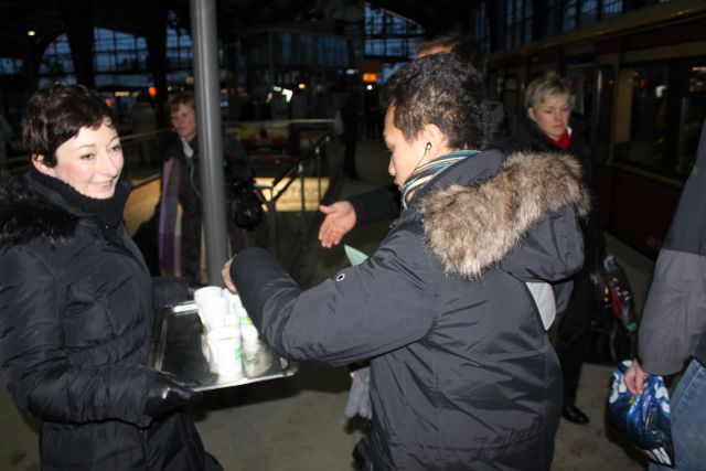 Morgens, 8:00 Uhr am Bahnhof Friedrichstraße: Um den S-Bahn fahrenden Berlinerinnen und Berlinern die Wartezeit angenehmer zu gestalten, verteilten Ramona Pop und weitere Mitglieder der grünen Fraktion aus dem Berliner Abgeordnetenhaus heute früh Heißgetränke. Der Unmut der Bevölkerung wächst zunehmend und keiner mag so recht daran glauben, dass die Lage sich durch politische Versprechungen bald bessern wird. Seit zwei Jahren drängen die Grünen auf konkrete Maßnahmen, z. B. die Beschaffung neuer Züge, eine Kündigung des aktuellen Vertrages und endlich eine Neuausschreibung für Streckenteile.