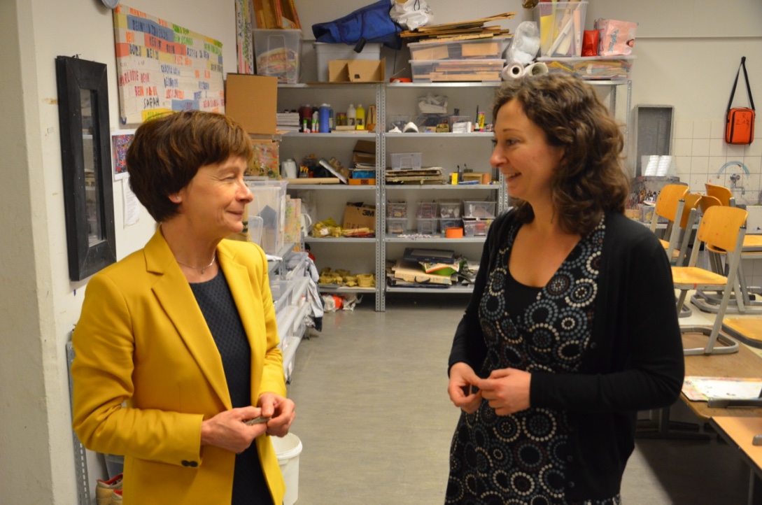 Beim Gang durch das Schulgebäude lernte Ramona Pop die verschiedene Themenräume kennen. Diese werden für individuelle Lerngruppen genutzt. So gibt es einen Mathematikraum, eine Kinderküche, ein Kinderlabor und einen Kreativraum.